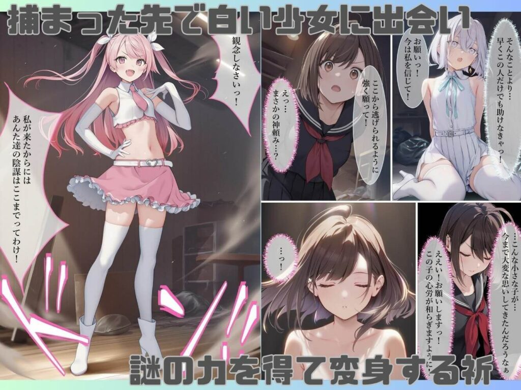 小ぶりなおっぱいと乾度良好な乳首の組み合わせが最高で、クリクリしたときの思わず出た甘い声色がエロいです。拘束されたまま、なすすべなく魔法少女のままセックスさせられる展開がたまりません。