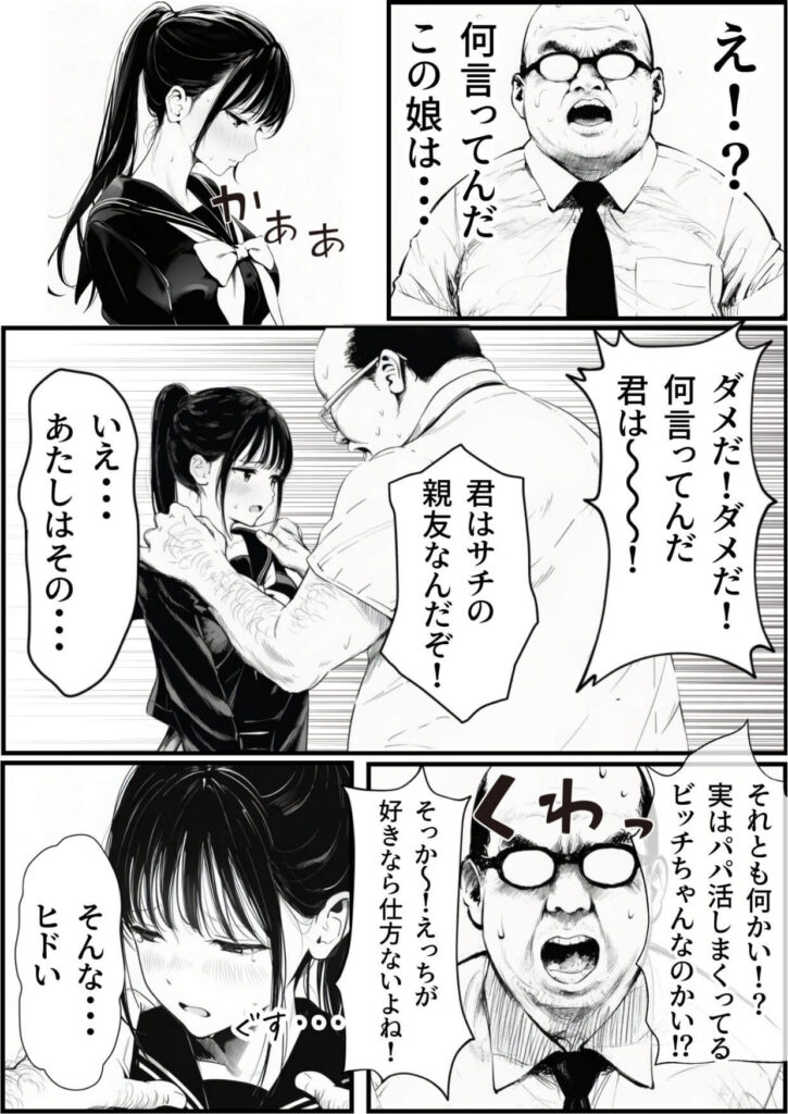 「こんなに爽やかな美少女が、中年の醜いおじさんに汚される」という背徳感を最大化。7:縦読み構成