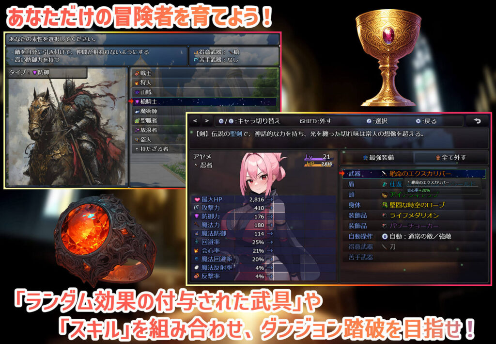 ゲームジャンルはファンタジーRPG。眠らない街「ルーンヘイム」で仲間を集めてダンジョンを攻略しながら、総勢20名の女冒険者とエッチなことをします。強姦や逆レイプ、純愛など、あなたの選択次第で様々なエッチを楽しめます。