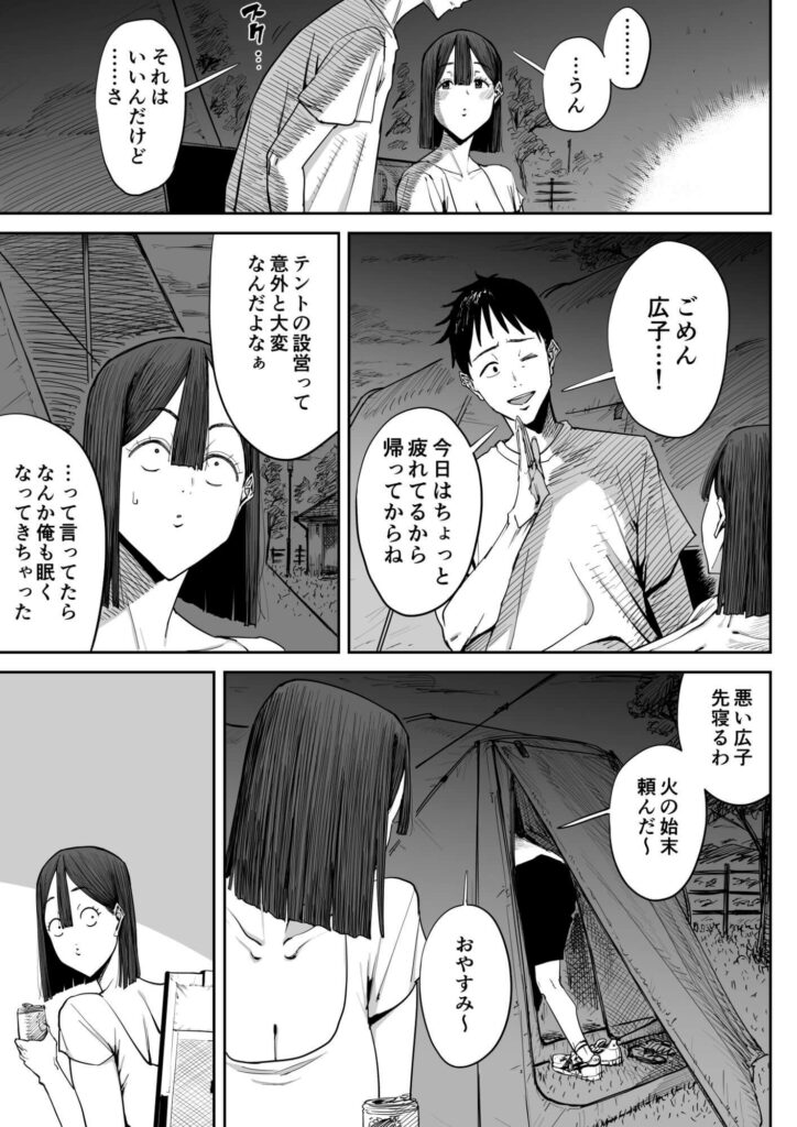 酒に酔い夫を床に誘うもあえなく断られ、やけ酒しているところを隣に設営していた若者グループに声をかけられる。