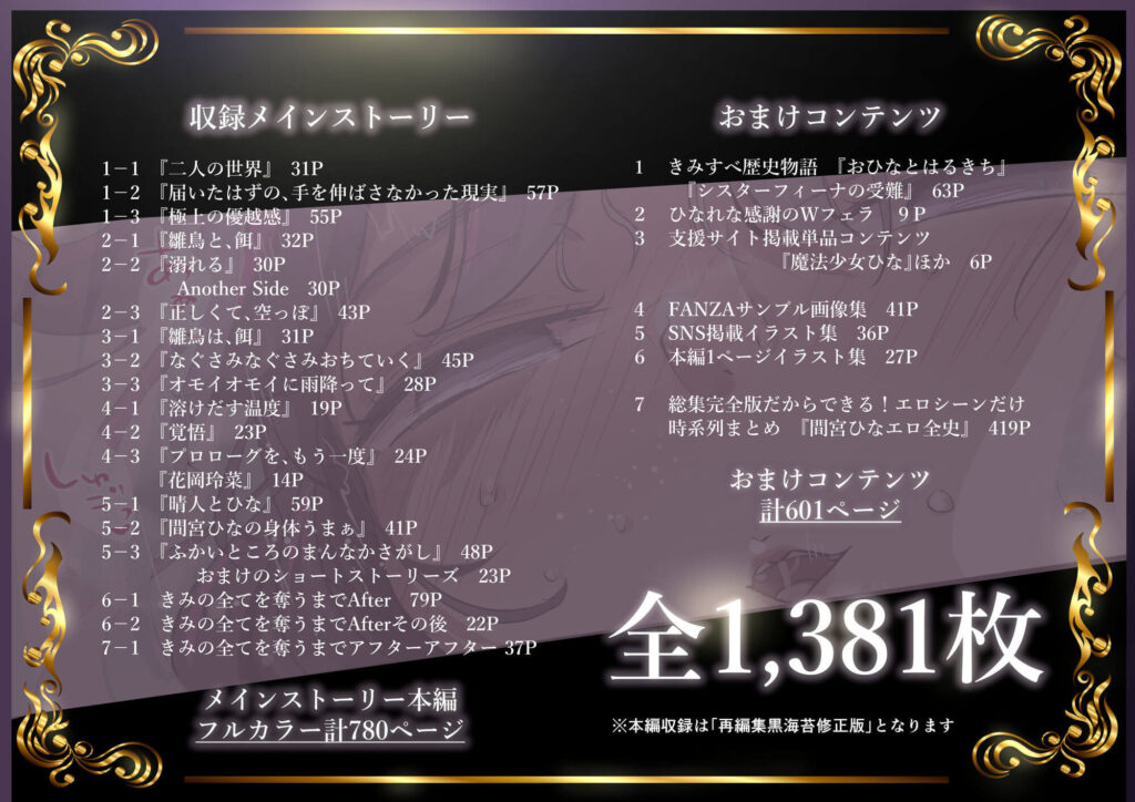 サークルたことかいとが精魂を込めて紡ぎ出した、純真な幼馴染が愛欲の深淵へと堕ちていく背徳の叙事詩。主人公である間宮ひなを中心に、四人の男たちが織りなす剥き出しの欲望と、その過程で変質していく性癖、そして崩壊と再生の軌跡を1,300ページを超える圧倒的ボリュームで網羅した完全版です。
