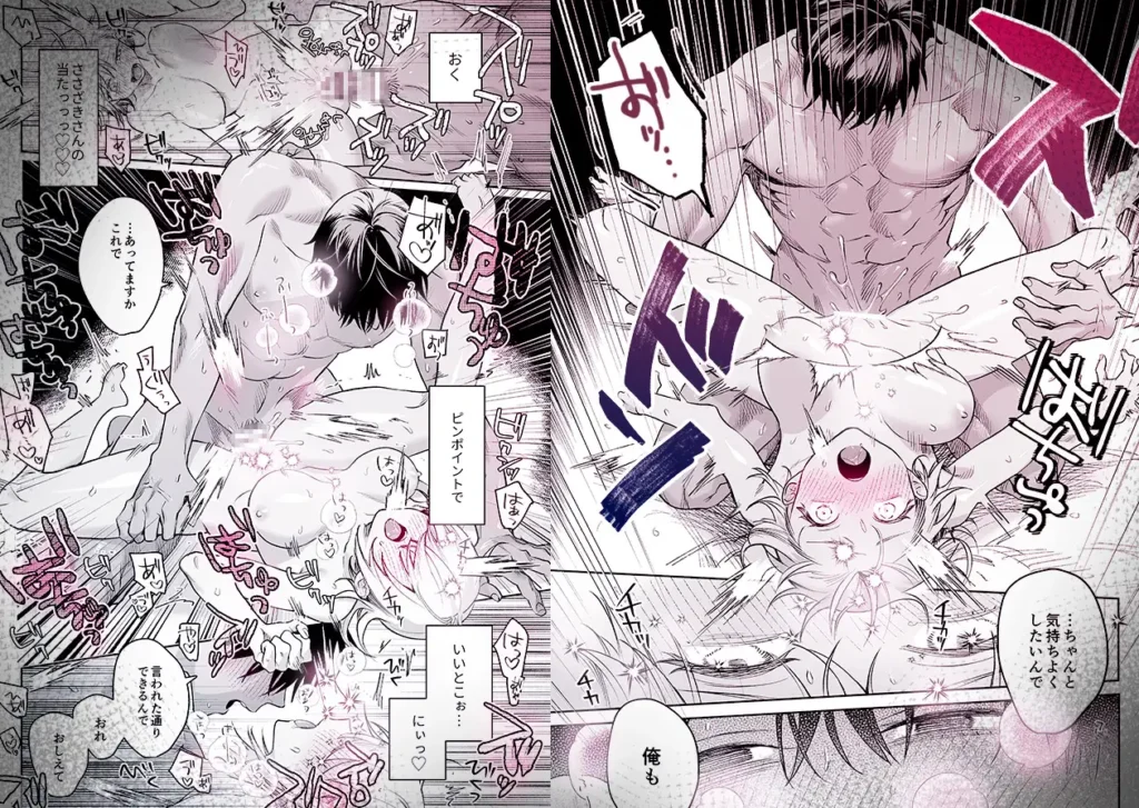 越智の乳首舐めや手コキに、普段クールな笹崎の顔がどんどんトロけていくシチュエーションには興奮します。