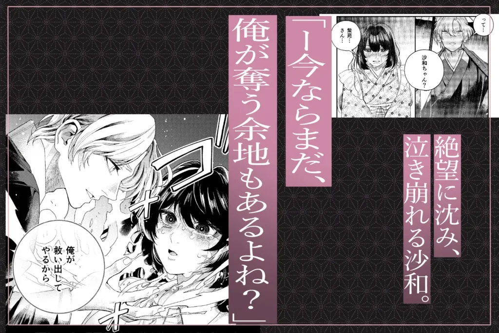 ○リコンと悪名高き貴族の老爺に金と引き換えに彼女を嫁がせようとしたのだ。絶望に沈み、紫苑を前にして思わず泣き崩れる沙和。