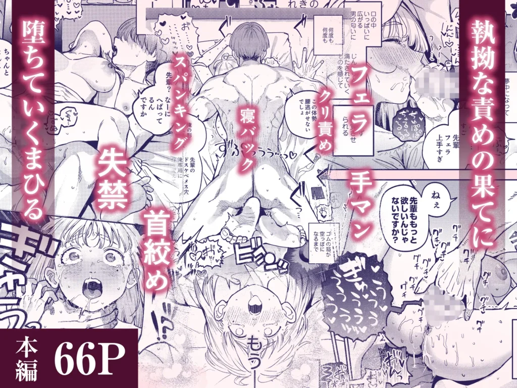 朗らかな雰囲気ながらM気質のスケベで裏垢をしているOL・まひると、優しいイケメン後輩男子だけと実はドSの刈谷という、それぞれのギャップ感がたまりません。